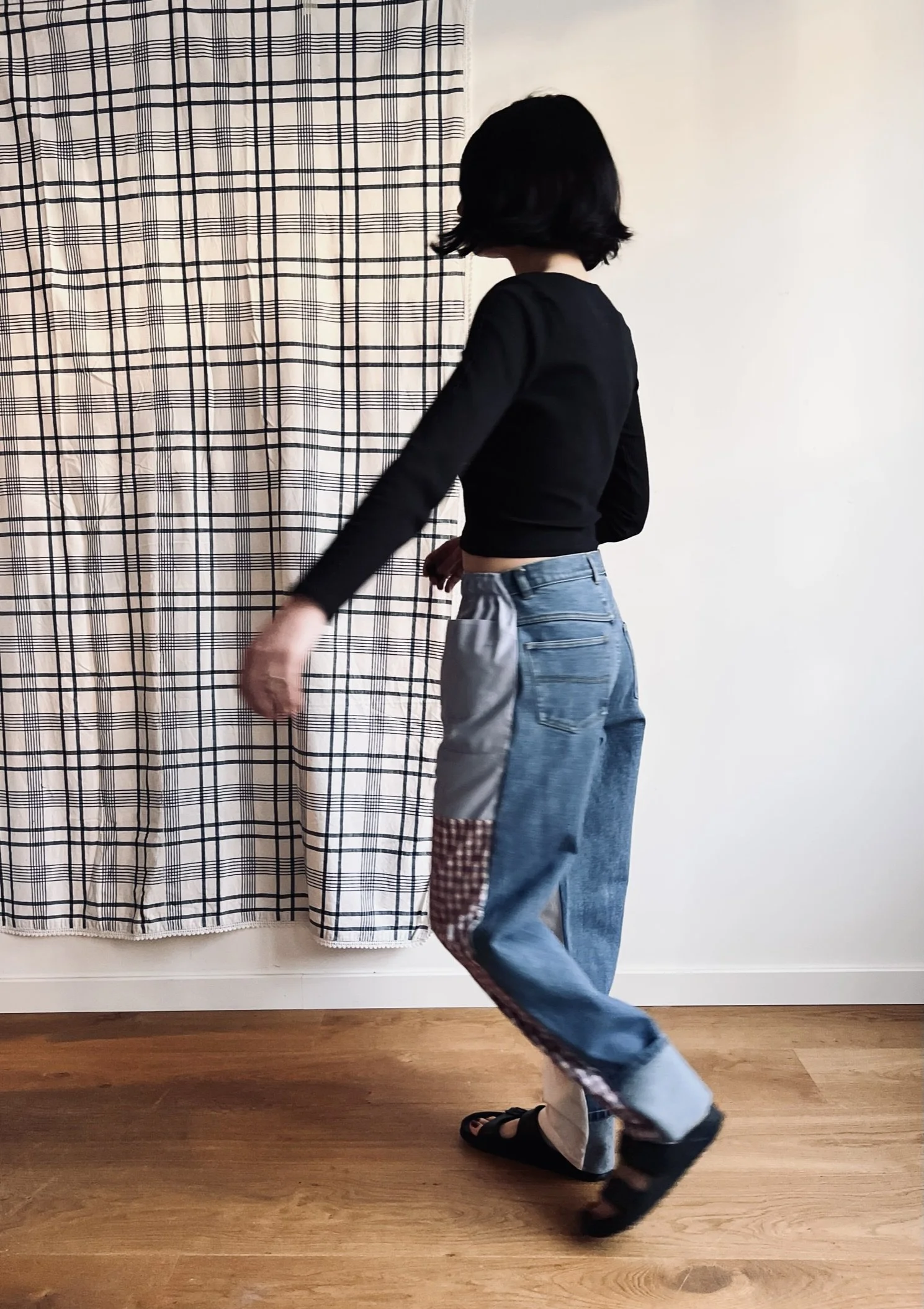 This reworked FULL LENGTH pant has a beautiful paneled design in front with a comfortable elastic waistband, One hidden side pocket made of deadstock fabric, one shirt pocket in front and two patch pockets at the denim side. The finished hem is folded at the back. Wear it with sneakers or slippers!