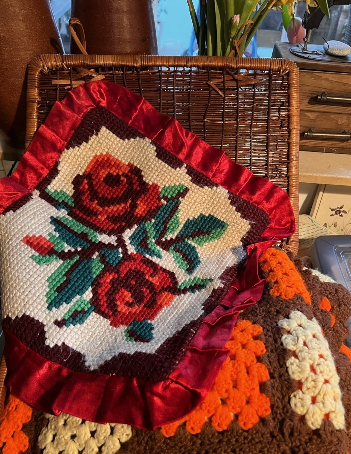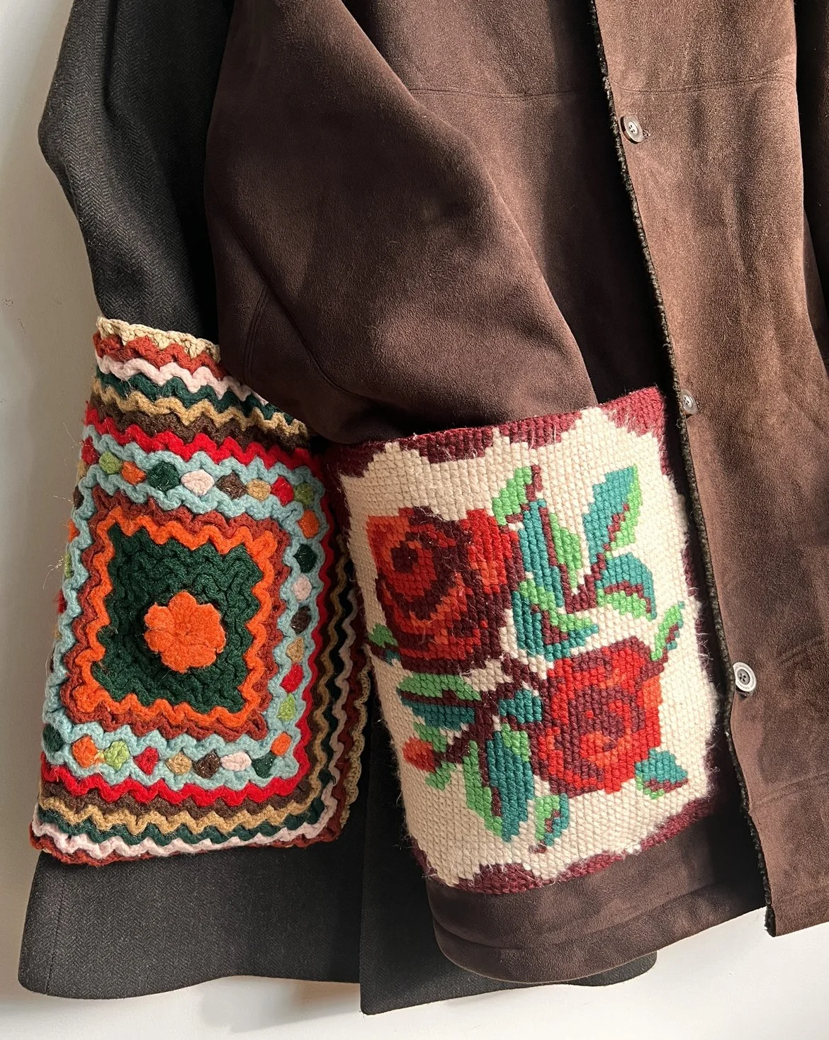 Special detail: Vintage hand-embroidered rose pillowcase from a Greek antique shop, reworked into a statement built-in pocket (with two openings). One hidden welt pocket remains under the embroidery.