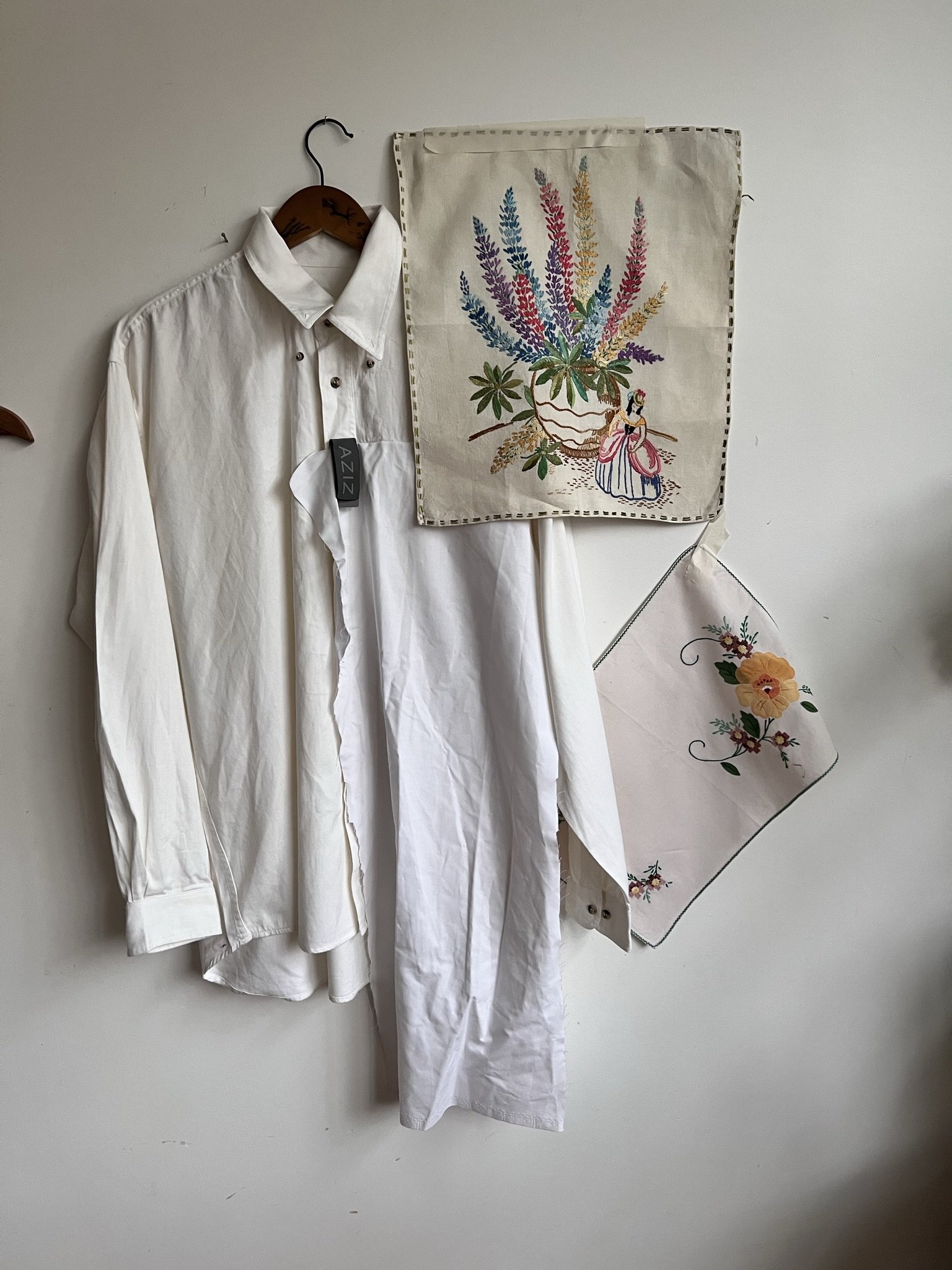 This shirt began as an oversized Dutch brand designer piece, sourced as unsold stock in 2022. In 2023, it was paired with a mix of vintage table runners. The result is a one-of-a-kind upcycled design blending crisp cotton, antique linen, and modern pleated detailing.