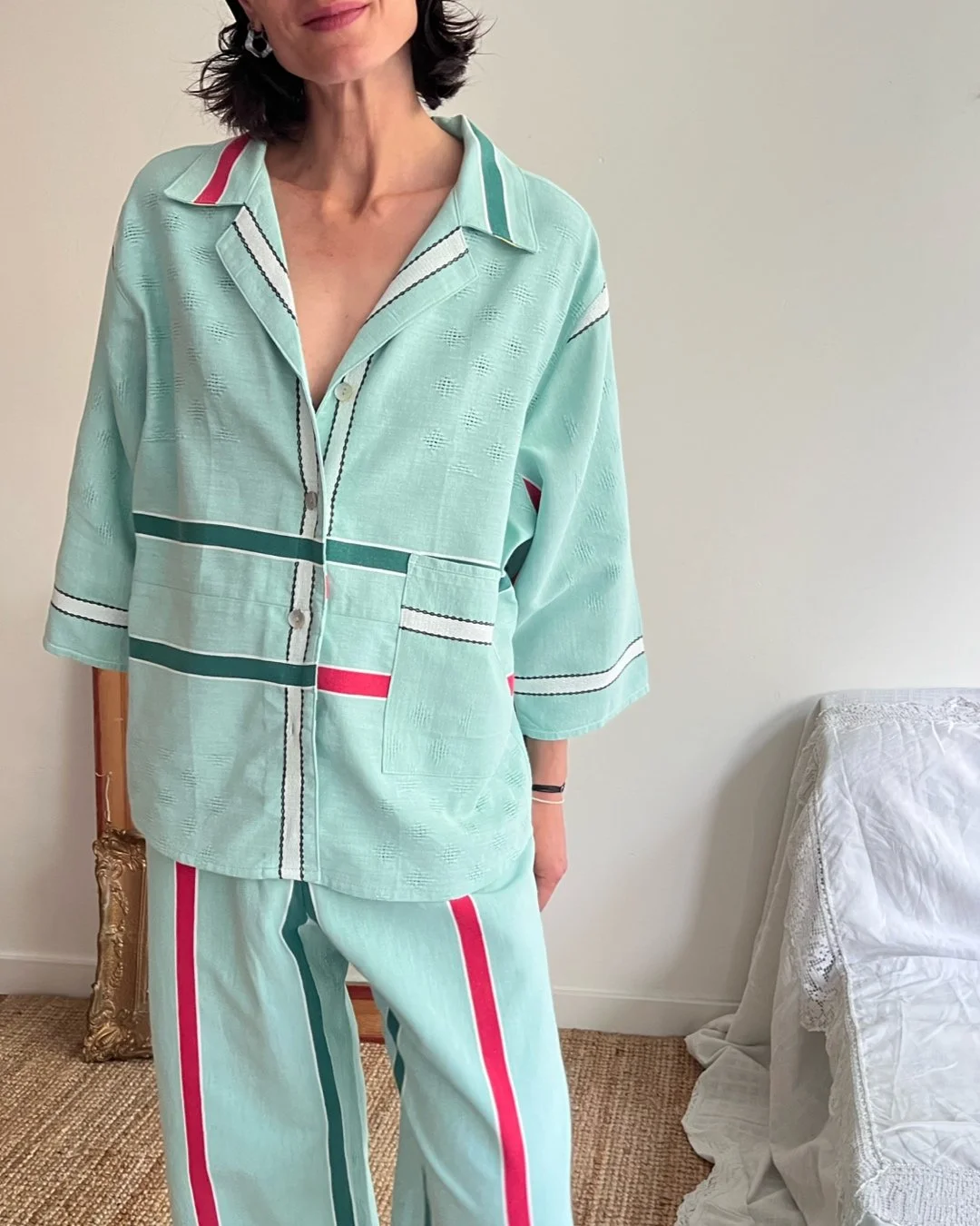 This spring, we finally felt ready to give it a second life. We transformed it into an easy, breathable shirt that you can wear every day with your favorite pants, skirts, summer shorts, sandals, or even ballerinas.