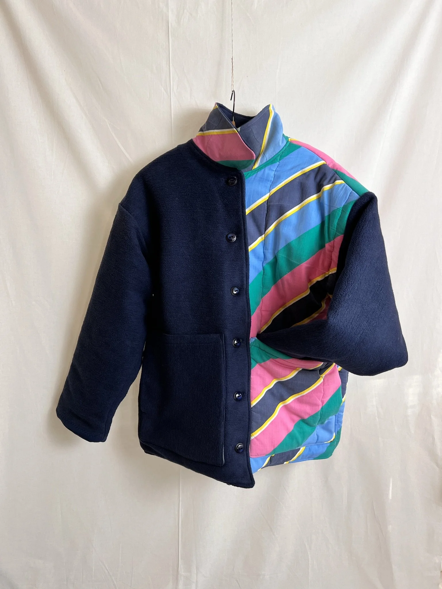 Tip: Awning Stripes & Indigo Blue Coat has a big Collar, and a oversized silhouette which gives you more room to layer turtlenecks or thin blouses underneath.